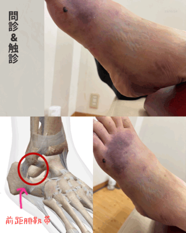 足首の外側にある前距骨靱帯損傷による捻挫の他に打撲も。