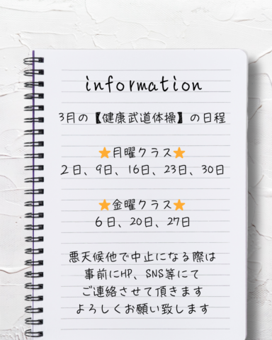 3月の【健康武道体操】の開催予定日のご案内 2026.03.03 お知らせ 3月の【健康武道体操】の開催予定日のご案内です。 ◎月曜クラス 2日、9日、16日、23日、30日 ◎金曜クラス 6日、20日、27日 ※12日は狛江市での体操指導の為、お休みとなります。 ※23日は【春分の日】にて祝日ですが、通常通り行う予定です。 悪天候等により中止になる場合は、事前にご連絡させて頂きます。 よろしくお願い致します。 ☆参加者募集中☆ お気軽にご参加下さい‼ 見学も大歓迎です‼